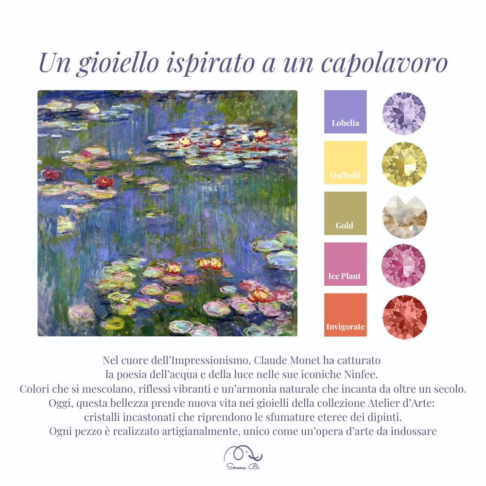 Il Girocollo Atelier d’Arte – Water Lilies trae ispirazione dall’iconico dipinto di Claude Monet, trasformando la poesia dell’impressionismo in un gioiello da indossare.
